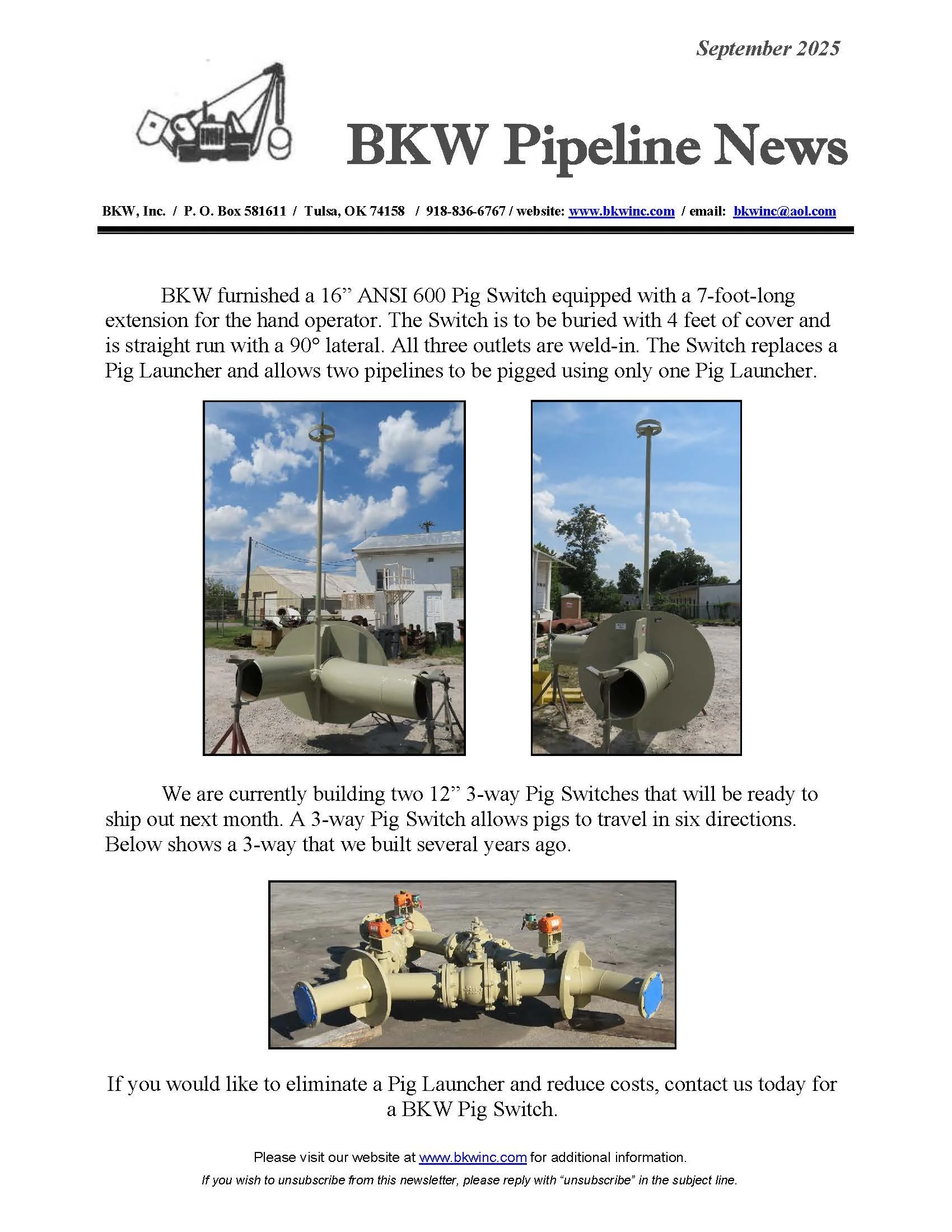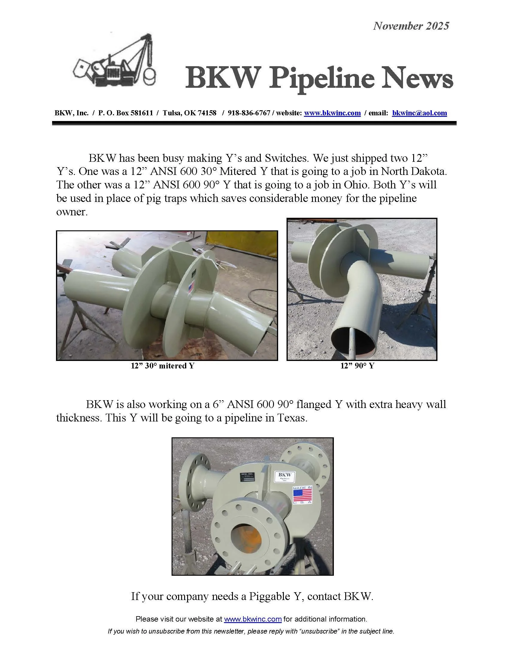 BKW PIpeline NewsOur monthly newsletters and published articles showcasing BKW's latest projects and more. BKW - What WE Do Download January 2025 Download February 2025 Download March 2025 Download May 2024 Download June 2025 Download July 2024 Download August 2025 Download September 2025 Download October 2025 Download November 2025 Download December 2025 Download My Life As A Pipeliner By Butch Webb Download