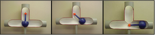 Pictures below shows the Tadpoles ability to pass through tees with a minimum of blow by. Arrows indicate where the Tadpole seals against pipe wall.