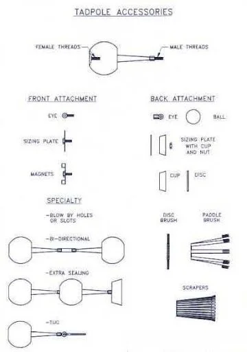 The Tadpole Pig has a male thread on the tail for attaching anything that is required to perform a function inside a pipeline. This can be brushes, scrapers, cups, or magnets. It can even be used to pull smart pigs or cables. The male thread is connected to a female thread in the nose of the pig using a cable. The female thread can be used to attach a sizing plate, magnets, cable eyes or another Tadpole Pig.