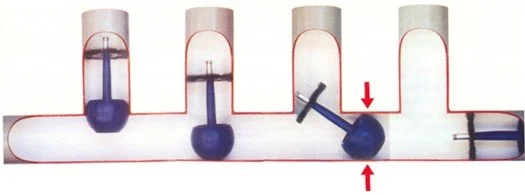 Pictures below shows the Tadpole’s sealing ability in a 90-degree ell using the trailer ball and steel brushes. Arrows indicate location of sealing against pipe wall.